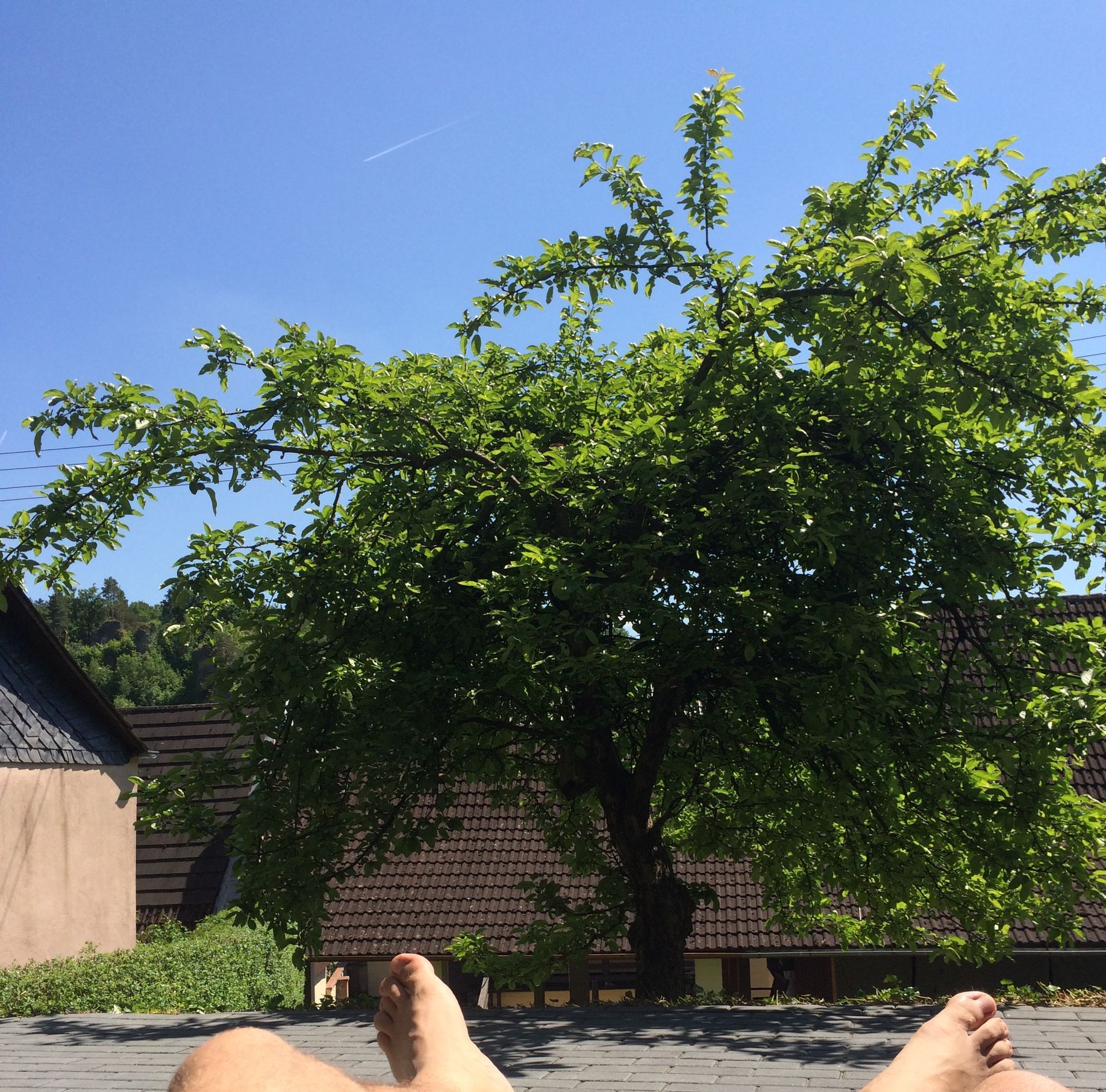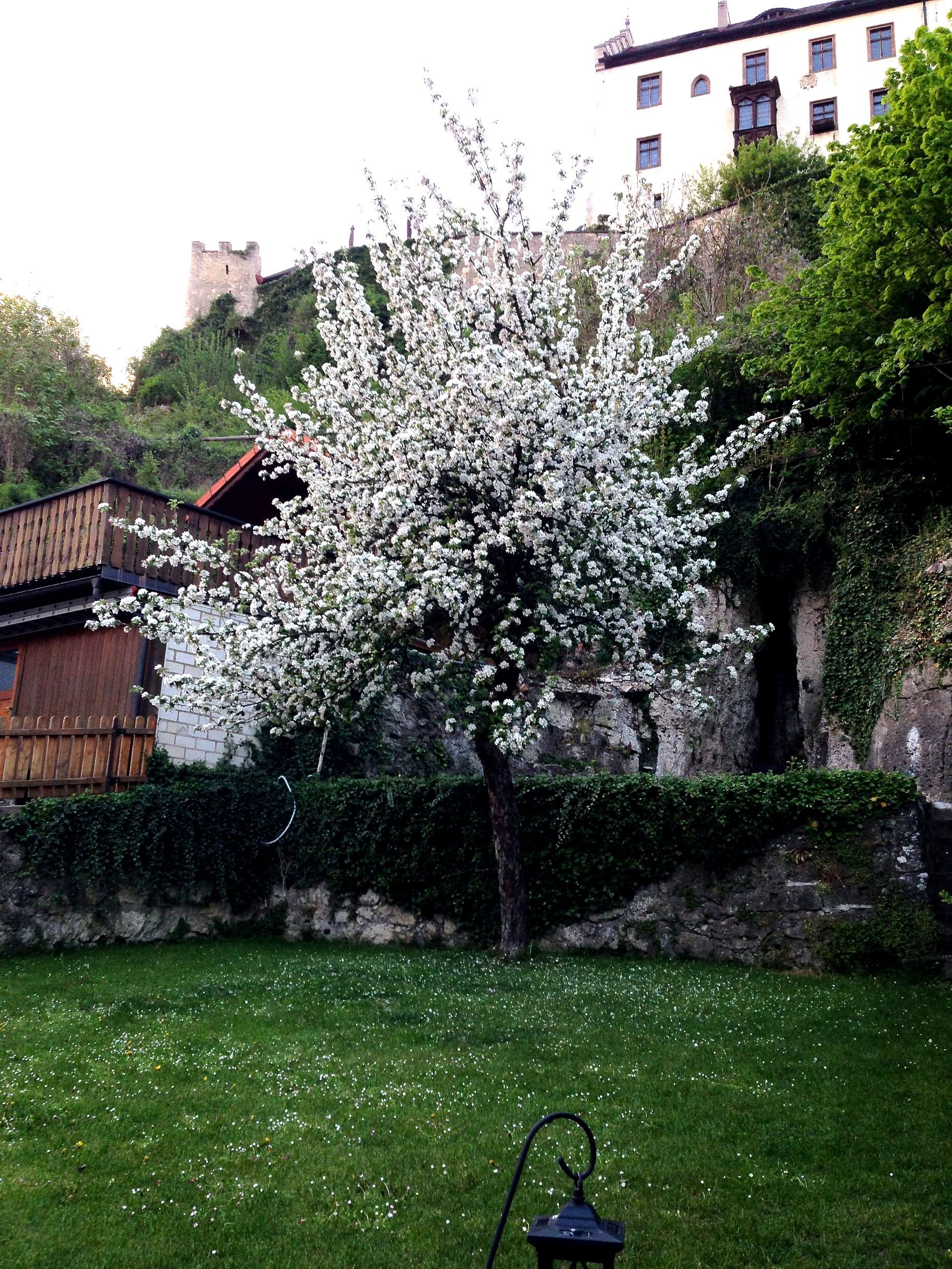 Unser Garten liegt ein wenig versteck hinter dem Haus direkt unter der Burg. Er ist terrassenartig angelegt und bietet eine großzügige Plattform mit Loungegruppe. Die Felsformation und der 100 Jahre alte Apfelbaum machen unseren Garten einzigartig.